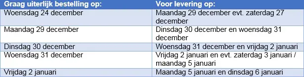 Net als voorgaande jaren doen wij weer een beroep op uw medewerking. Uiteraard doen wij onze uiterste best om uw bestelling goed uit te voeren; klanttevredenheid staat bij ons immers hoog in het vaandel. Indien u bij het bestellen meerdere mogelijke afleverdagen opgeeft - rekening houdend met bovenstaand schema - helpt dit enorm. Namens al onze medewerkers wensen wij u alvast fijne feestdagen en hartelijk dank voor uw medewerking!