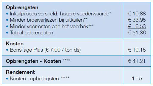 Rendement van BonSilage Plus is 1 op 5. Dus iedere geïnvesteerde euro levert u € 5,- aan rendement.