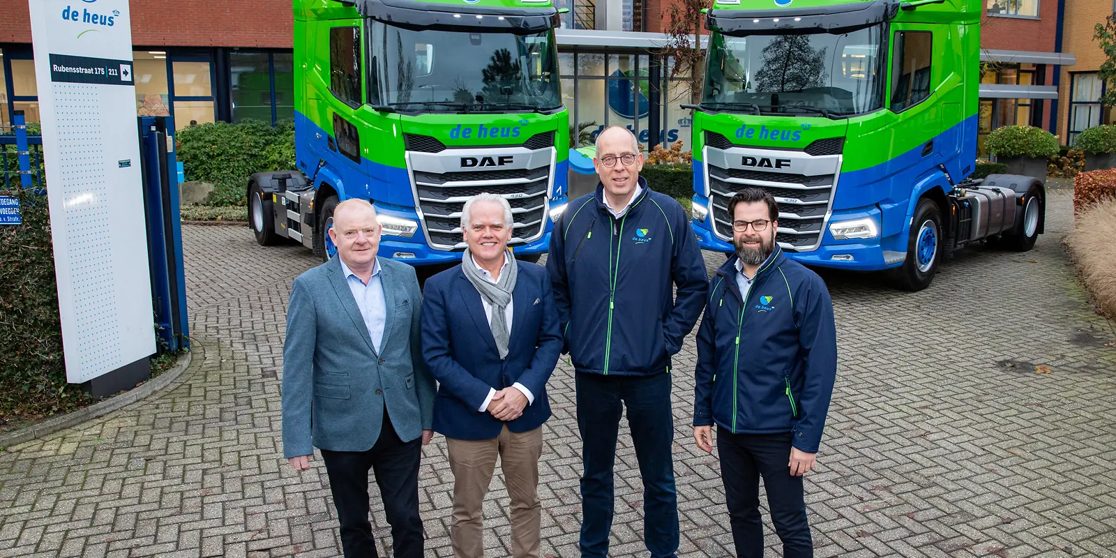 Tijdens de officiële overhandiging ontvingen Martin Rijnen (Operationeel Directeur) en Wim van Soest (Financieel Directeur) de eerste twee trucks uit handen van Tom van de Mosselaar, directeur van Bakker Bedrijfswagens en Marijn Bos, verkoopleider.