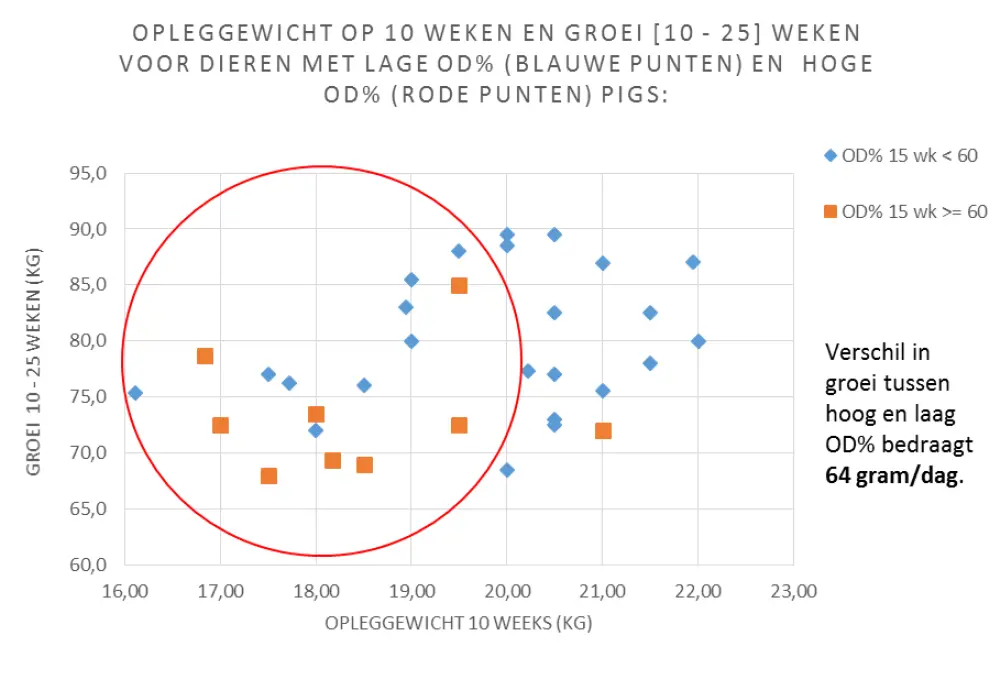 De mate van Salmonellabesmetting wordt bepaald aan de hand van het Optical Density-percentage (titer). Dit percentage geeft de hoeveelheid antistoffen tegen Salmonella in het bloed weer. In het onderzoek hadden bijna alle biggen bij opleg een titer die lager was dan 10 en waren daarmee negatief. Daarna volgde een snelle stijging. Biggen met een opleggewicht onder de 20 kg hadden 5 weken na opleg een titer van 61, terwijl zwaardere biggen slechts op een titer van 23 uitkwamen. Steeds meer slachterijen vragen om lage Salmonella titers, ze spreken van een positieve uitslag bij titers van boven de 40.