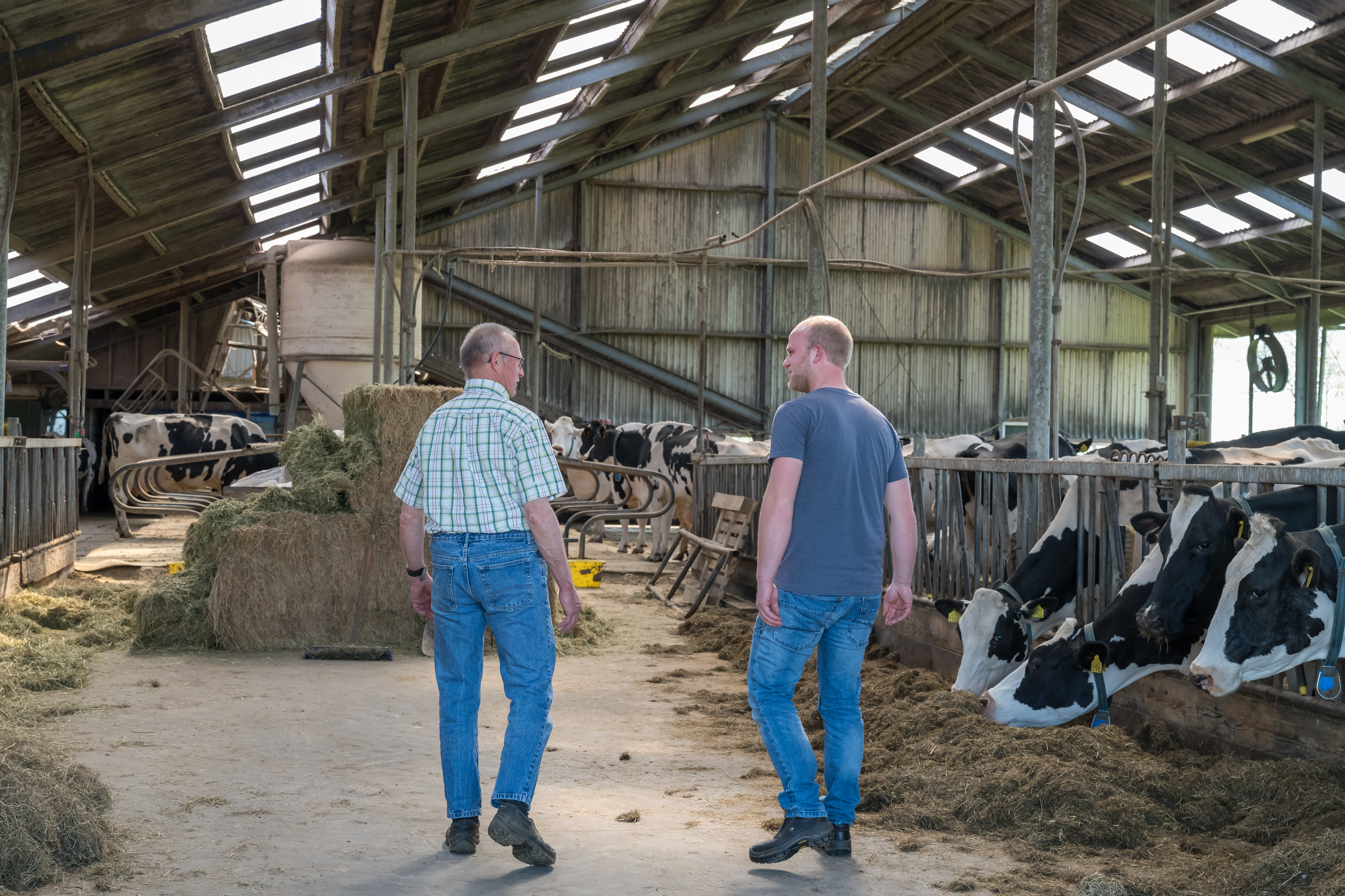 “Wij wilden zeker geen te koop-bord op het erf, maar onze werkzaamheden langzaam afbouwen en overdragen. Daar beleven wij zelf meer plezier aan. Als je een opvolger wilt, moet het bedrijf natuurlijk levensvatbaar zijn. Daarom hebben we het altijd up-to-date gehouden”, vertelt Aad. In het najaar van 2020 plaatsten ze daarvoor een oproep op ‘Boer zoekt boer’. Leon had daar al eerder een account gemaakt. Tijdens zijn opleiding aan de HAS was het echt gaan kriebelen, hij vertelt: “Daar spreek je veel bedrijfsopvolgers en dat was ook mijn droom: melkveehouder worden.” Via ‘Boer zoekt boer’ werd het eerste contact gelegd.