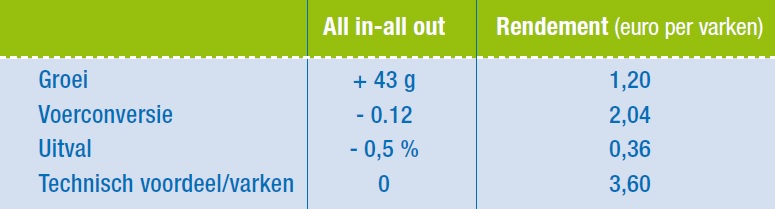 De winst bij all in-all out danken we vooral aan de betere technische resultaten. De resultaten die De Heus dit jaar en voorgaande jaren verzamelde, laten een vergelijkbaar beeld zien. Bij toepassing van all in-all out is de groei 43 g per dag hoger, de voerconversie 0,12 lager en de uitval ook 0,5 procent lager. Deze technische voordelen leveren al een forse rendementsverbetering op.Daarnaast zijn de medicijnkosten lager.