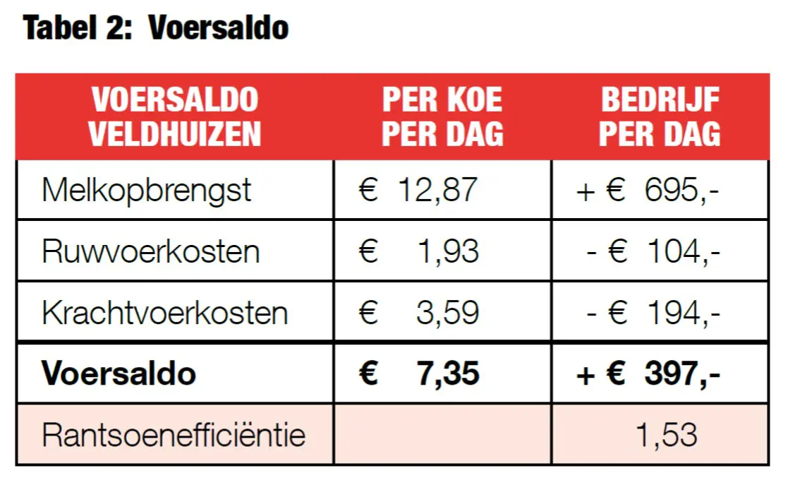 De hoge melkproductie per koe vertaalt zich in een hoge melkopbrengst per dag, waardoor het saldo per koe per dag tussen € 7,- en € 8,- ligt.