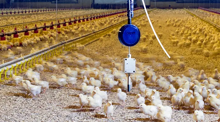 - In stallen met grondhuisvesting (vleeskuiken- en opfokstallen) is dit vrij eenvoudig te realiseren door de sensor te koppelen aan een oplierbare voer of waterlijn. Hiermee wordt voorkomen dat de sensor tussen de dieren komt te hangen en door de dieren beïnvloed kan worden