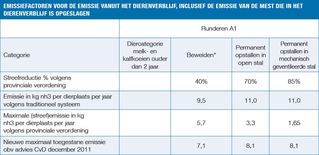 Een vraag die niet meteen te beantwoorden is en sterk afhankelijk is van de ondernemer, is zijn specifieke bedrijfssituatie en zijn bedrijfsvisie. Met dit artikel proberen we hier een kleine toelichting op te geven. Naast de eerdergenoemde ondernemerafhankelijke aspecten zijn er ook aspecten vanuit de overheden waar rekening mee moet worden gehouden. Eén van die overheden zijn de provincies. Meerdere provincies hebben al een verordening stikstof opgesteld. Dit betreft bovenwettelijk beleid en de verwachting is dat meerdere provincies deze verordeningen ook gaan volgen. Zoals in de tabel vermeld kunt u zien dat het beleid van bijvoorbeeld de provincie Brabant gericht is op minimaal 40% ammoniakreductie bij melkkoeien die worden beweid en minimaal 70% ammoniakreductie bij melkkoeien die permanent worden opgestald. De in de tabel vermelde streefemissies (5,7 kg bij beweiden en 3,3 kg bij opstallen) die bij de streefdatum van 1 januari 2028 moeten worden bereikt, geven duidelijk aan dat er, als het aan de overheid ligt, nog vele innovaties moeten plaatsvinden om de ammoniakemissie in de (nabije) toekomst verder te verlagen. Mogelijk kan het verhogen van de huidige traditionele normen, waar ook over wordt gesproken, ook nog perspectief bieden en het behalen van de gestelde emissies.