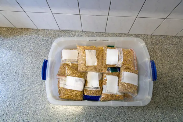Van elke voerlevering wordt een voermonster genomen. Deze wordt bewaard op het grootouderdierenbedrijf zodat later het voer getraceerd kan worden op productienummer, datum en tijd.