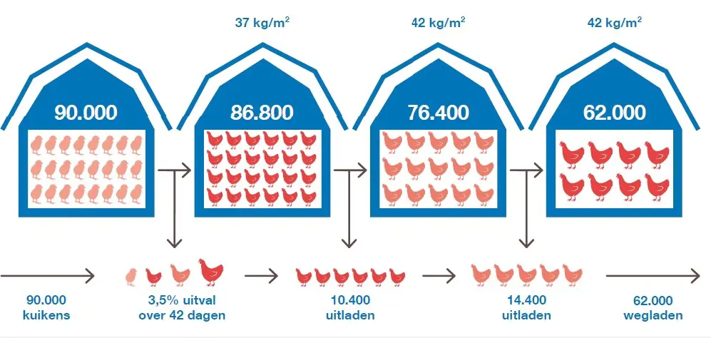 Een ronde begint niet bij de ontvangst van kuikens maar bij het inleggen van de broedeieren. Neem contact op met de planning en overleg over het eventuele uitladen met de bijbehorende gewichten en het wegladen. Met de juiste bezetting optimaliseert u ook meteen de groei en de voederefficiëntie. Bekijk een volledig artikel over dit onderwerp op de website: ‘Zorg voor optimale bezetting’.