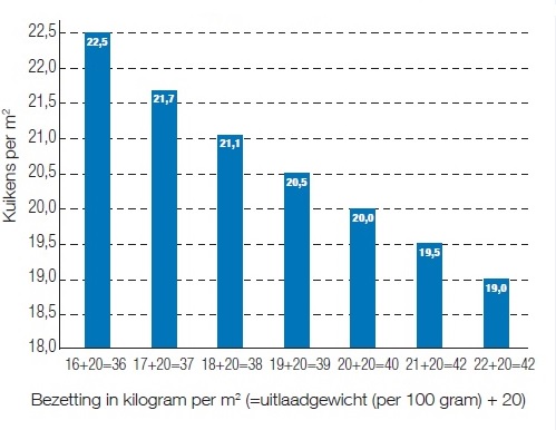 Grafiek 1 Op te zetten aantal vleeskuikens per vierkante meter in relatie tot bezettingsgraad bij uiladen