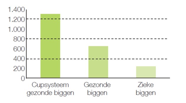Uit diverse onderzoeken wereldwijd blijkt dat met cups in de kraamstal veel voordelen te behalen zijn. Uit de proeven die gedaan zijn blijkt dat de tomen uniformer worden. De kleine biggen komen beter mee en zijn duidelijk zwaarder op het moment van spenen. Over de verschillende proeven heen blijkt dat het gemiddeld speengewicht met 0,5 kilo stijgt bij het toepassen van cups in het kraamhok. Een ander groot voordeel dat in de proeven aangetoond wordt is dat er meer biggen bij de zeug grootgebracht kunnen worden en dat het uitvalspercentage voor spenen lager is. Gemiddeld genomen over de proeven heen is het uitvalspercentage 3,1 procent lager en wordt er 0,5 big per zeug meer gespeend. Uit eigen onderzoek blijkt dat, naast bovenstaande voordelen, bij het toe-passen van het cupsysteem ook darmgezondheid van de biggen in de kraamstal toeneemt. Uit grafiek 1 blijkt dat de darmvloklengte duidelijk langer is en de darmen daarmee gezonder zijn.
