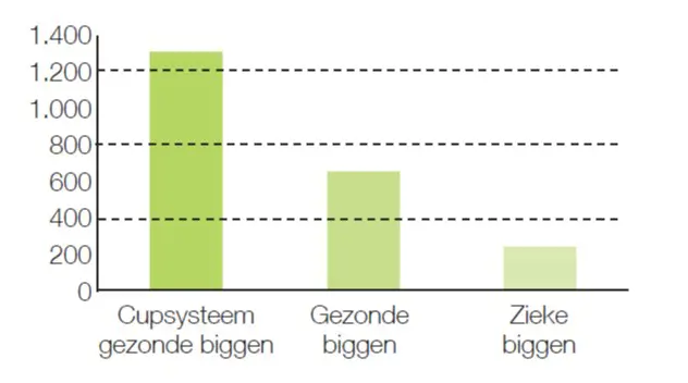 Bij doorvragen blijkt het te gaan om ongeveer 1 uur werk per week. De bedrijven die met het cupsysteem in de kraamstal werken, spenen op jaarbasis 1,68 biggen per zeug meer (32,83 ten opzicht van 31,15 biggen) dan de andere bedrijven uit de enquête. Dit komt door 2,1 procent minder uitval in de kraamstal, een hogere worpindex (2,43 ten opzichte van 2,40) en 0,1 meer levend geboren biggen per worp. Op de praktijkbedrijven die met het cupsysteem werken worden de cups op dag twee open gezet. De eerste melk wordt gemiddeld 12 dagen lang verstrekt en daarna wordt er gemiddeld nog negen dagen een tweede voersoort verstrekt. De bedrijven die bijgehouden hebben hoeveel voer de biggen via het cupsysteem opnemen gaven aan dat dit ongeveer 950 gram per big is.