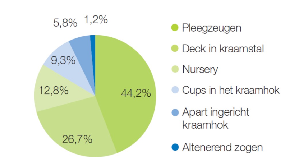 Langzaam maar zeker komen er steeds meer bedrijven die investeren in het cupsysteem in de kraamstal. Uit twee enquêtes die stagiaires eind 2014 voor ons gehouden hebben blijkt dat, van de 96 bedrijven die hebben deelgenomen aan de enquêtes, 9,3 procent werkt met het cupsysteem in de kraamstal. Zie het taartdiagram voor de verdeling in de alternatieven opfoksystemen die door deze 96 bedrijven toegepast worden.