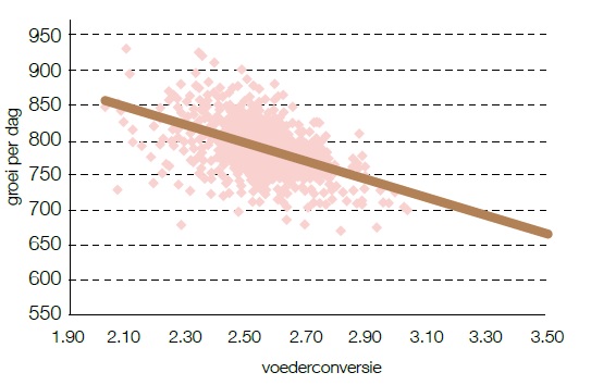 Figuur 1 Agrovision 2012: Verband tussen groei en voederconversie van varkens in Nederland.