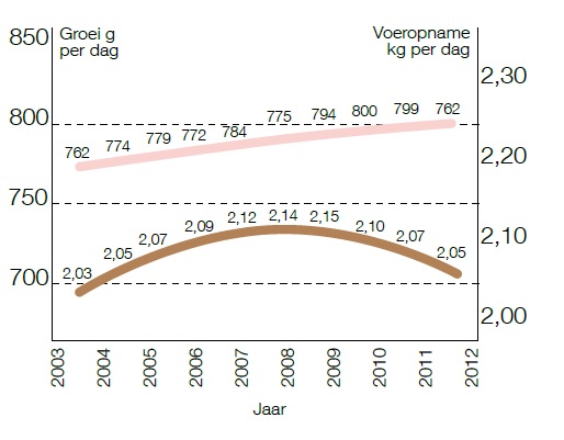 De cijfers van Agrovision laten zien dat de voeropname per dag en de voederconversie de laatste jaren licht daalden. De groei per dag blijft daarentegen stijgen. Het mesten van beren is daar een belangrijke oorzaak van. Zij groeien sneller en efficiënter. Omdat de voeropname daalt, heb je bij een stijgende groei meer aminozuren per kilogram voer nodig. Uit overleg met fokkerijgroeperingen en aminozuurleveranciers blijkt dat een geconcentreerder voer nodig is om de beste technische resultaten te krijgen. Hoe geconcentreerd, hangt af van het economische resultaat.