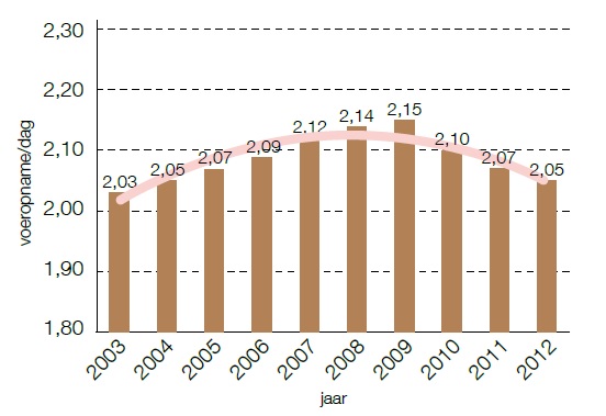 Figuur 5 Trend van de voeropname (Agrovision) per vleesvarken per dag in Nederland.