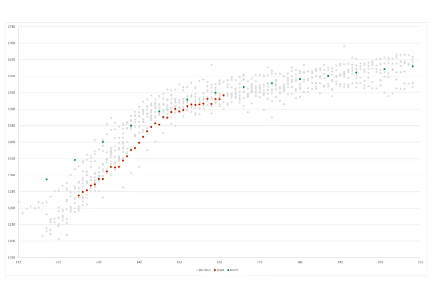 Een goede monitoring van het diergewicht is een perfecte tool om te zien of de dieren goed door ontwikkelen. Deze grafiek geeft bijvoorbeeld de groei aan van de jonge hennen. In de grafiek is gekeken naar de diergewichten van dag 112 (16W.) tot en met dag 210 (30W.)