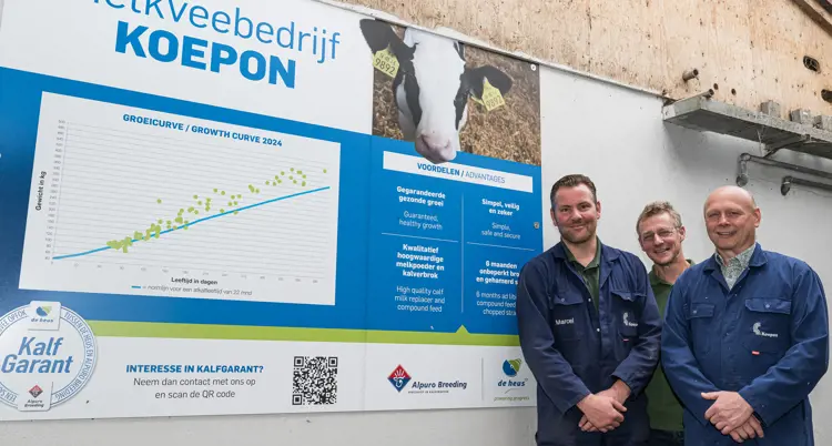 Kalf Garant is een samenwerking tussen De Heus en Alpuro Breeding. Door kennis te bundelen op het gebied van voeding en jongvee-opfok, is een praktisch en succesvol concept ontstaan. De kern van het concept: Fok Top melkpoeder, gecombineerd met onbeperkt Kalf Garant brok en gehakseld stro in de eerste zes maanden. Het resultaat: gegarandeerde groei met goed ontwikkelde vaarzen die ruim binnen twee jaar kunnen afkalven. Op het Veebedrijf Koepon wordt het al jaren met veel succes toegepast.