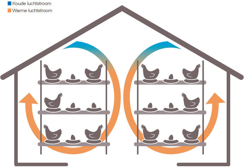 Deze lucht moet niet door, maar ruim boven de dieren stromen om daarna op te warmen. De lucht moet niet botsen tegen obstakels. Een juiste opening en luchtsturing van de ventielen is hierbij belangrijk.