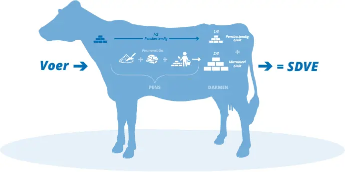 Wanneer je koeien voert, ben je eigenlijk de bacteriën in de pens van de koe aan het voeren. De pens is de motor van de koe die haar in 2/3e van de energiebehoefte voorziet. Die bacteriën hebben een bepaalde behoefte aan energie en eiwit om te kunnen groeien. Wanneer ze groeien leveren ze energie aan de koe en vormen ze microbieel eiwit wat in de darm kan worden opgenomen. Dit microbiële eiwit wat in de pens gevormd wordt, is de beste eiwitbron voor de koe. Dus zowel voor de energiebehoefte van de koe als voor de eiwitbehoefte van de koe is het van belang om de bacteriën in de pens zo goed mogelijk te laten groeien.