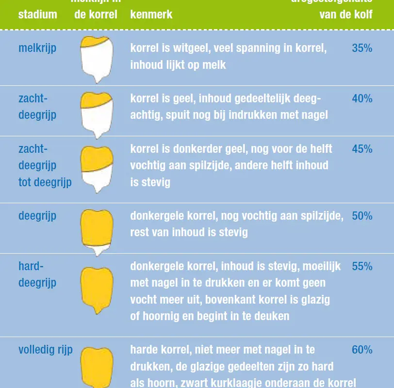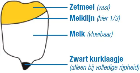 Het kolfaandeel ten opzichte van het plantaandeel en het drogestofgehalte van de kolf zijn het meest bepalend voor de totale droge stof van snijmaïs. Bij een normaal kolfaandeel (50 procent) en een goede deegrijpheid van de korrel (50 procent) wordt 70 procent van de totale droge stof van snijmaïs bepaald door de kolf. Voor de voederwaarde is het van essentieel belang om de rijpheidsstadia en de bijbehorende droge stof van de kolf te kunnen beoordelen (figuur 2). Om het gewas goed op rijpheid en droge stof in te schatten, is het noodzakelijk om een maïskorrel uit het midden van de kolf in de lengte door te snijden, zodat de positie van de melklijn duidelijk zichtbaar is. Ook is het raadzaam om dit op meerdere plaatsen in het perceel steekproefsgewijs te doen. Door verschillende omstandigheden kan de afrijping binnen de percelen soms sterk wisselen.De deegrijpheid van de korrel bepaalt voor meer dan 70 procent het drogestofgehalte van snijmaïs!