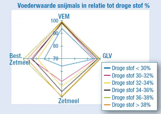 Hoe groter de oppervlakte van het kader, hoe hoger de voederwaarde van de snijmaïs is. Snijmaïs met een droge stof lager dan 32 procent scoort duidelijk laag in voederwaarde. Snijmaïs met een droge stof tussen 32-34 procent heeft een lagere GLV, zetmeel en bestendig zetmeel, maar laat wel een behoorlijke VEM zien. Deze snijmaïs kan toch een relatief hoge VEM realiseren door een hoge plantverteerbaarheid en is vooral geschikt in rantsoenen met een groot aandeel snijmaïs. Snijmaïs met droge stof rond 35 procent is juist geschikt in rantsoenen die maximaal 6 kg droge stof snijmaïs bevatten. De kwaliteit wordt ook bepaald door het hakselen en inkuilen. De stoppellengte beïnvloedt eveneens de voederwaarde van snijmaïs. Door op hogere stoppellengte te hakselen, neemt het kolfaandeel ten opzichte van het plantaandeel toe, zodat de voederwaarde stijgt. De fijnheid van hakselen is optimaal wanneer de plantdelen net zo groot zijn als ‘de lengte van je neus’ en de korrel in minimaal vier delen wordt gesplitst. Kortom: het gewas niet te fijn hakselen en de rollen van de korrelkneuzer voldoende dicht op elkaar zetten. Het apart aanleggen van een zomeren winterkuil voor snijmaïs biedt ook voordelen: de zomerkuil kan dan minder hoog worden gemaakt en een lager drogestofgehalte bevatten. Hierdoor zal de voersnelheid in de zomer minimaal 2,5 meter in de week zijn en is de broeigevoeligheid van de kuil minder. Het voordeel van het gebruik van inkuilhulpmiddelen is duidelijk bewezen. Bonsilage Maïs is een inkuilhulpmiddel dat op drie punten verbetering geeft: