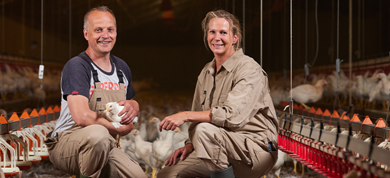 Bij het opfokken van ouderdieren worden hennen en hanen vanaf dag één tot ongeveer 20 weken klaargemaakt voor de productie van broedeieren op een vermeerderingsbedrijf. de familie Beute uit Ureterp, Hans en Ria, zorgen met begeleiding van De Heus voor de opfok van goede ouderdieren. Ze maken ze klaar voor de keten om daarmee goede vleeskuikens te kunnen waarborgen en uiteindelijk mooi kippenvlees.