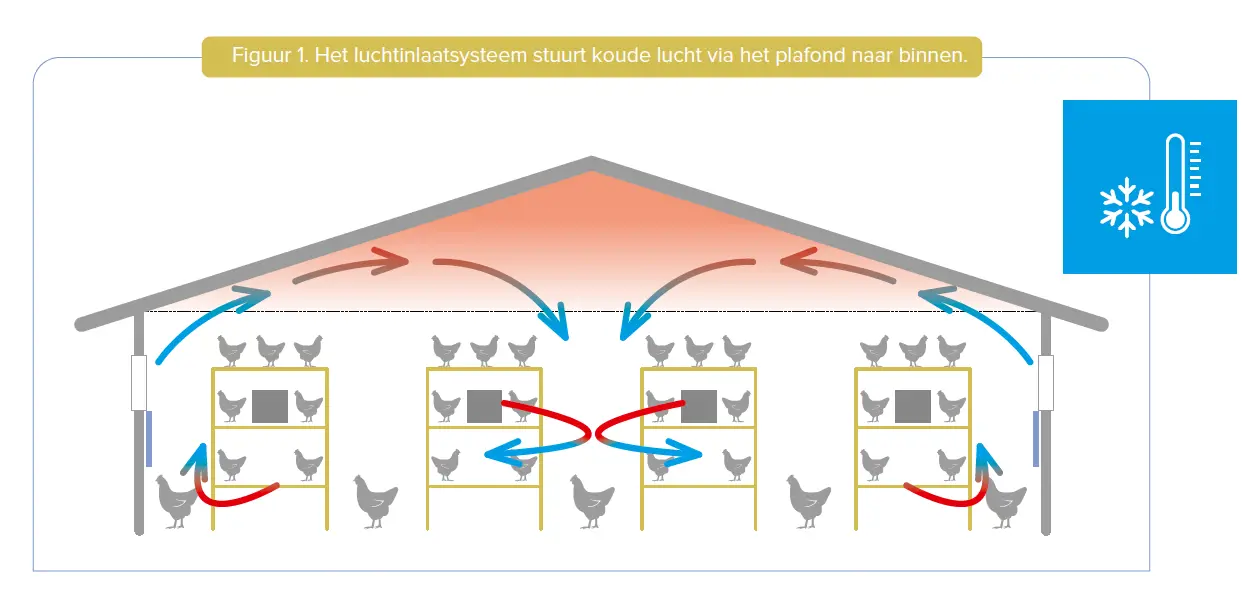 Hierdoor zal de binnenkomende lucht gaan mengen met aanwezige warme stallucht. Omdat de snelheid verminderd, zal deze uiteindelijk naar de dieren zakken en ze zo voorzien van verse lucht. Ook zal de opgewarmde lucht weer terugkeren naar de buitenmuur waardoor het strooisel onder de volières en in de scharrelruimten kan worden gedroogd.