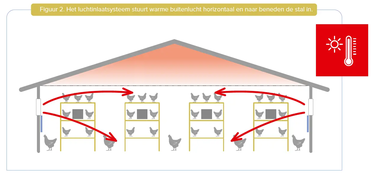 Bij hoge buitentemperaturen zal de binnenkomende lucht meer horizontaal en naar beneden worden gestuurd zodat de dieren afkoelen door een directe luchtstroom (figuur 2).