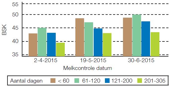 Groeien in meeropbrengsten per jaar op het bedrijf kan. Sinds 1 april 2015 is De Heus gestart met de ‘meer melk-voeren strategie’. Veel bedrijven passen deze strategie toe door intensiever te voeren met voersoorten zoals de Stabiel, de Solide en de Booster. Analyse van resultaten laten op deze bedrijven een stijging van de Bedrijfsstandaardkoe (BSK) zien van 2,5 tot maar liefst 5 punten, met op de meeste bedrijven vergelijkbare gehalten aan vet en eiwit (zie grafiek 1).