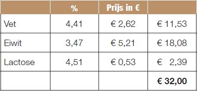 In de berekeningen nemen we als uitgangspunt (strategie 0) een bedrijf met 80 melkkoeien met een 305-dagen melkproductie van 9.000 kg en de gemiddeld afgeleverde gehalten. De opbouw van de melkprijs van € 32,00 per 100 kg bestaat uit vet van € 2,62 per %, eiwit € 5,21 per % en lactose € 0,53 per % (zie tabel 1).