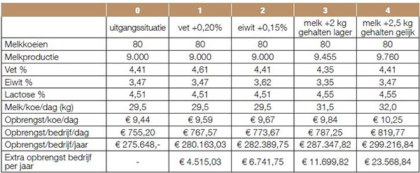 Vervolgens wordt gekeken naar verschillende strategieën (1 t/m 4) ten opzichte van het uitgangspunt (strategie 0). In strategie 1 wordt de gemiddelde productie per koe per dag op 29,5 kg melk gehouden, maar verhogen we het vetpercentage met 0,20% tot 4,61% vet. Dit geeft een extra jaaropbrengst van plusminus € 4.500,- voor het bedrijf. In strategie 2 blijft ook de dagproductie per koe gelijk, maar wordt het eiwitpercentage met 0,15% verhoogd tot 3,62% eiwit. Dit levert het bedrijf ruim € 6.700,- per jaar op. Strategie 3 is gericht op meer melk per koe per dag. Ten opzichte van de uitgangssituatie is de productie per koe gestegen met 2 kg, van 29,5 kg naar 31,5 kg per koe per dag. De gehalten (vet en eiwit) worden in strategie 3 lager ingeschat als gevolg van een verdunning van de melk bij meer liters. Ondanks deze lagere gehalten geven de extra kilogrammen melk per koe per dag een aanzienlijk hogere jaaropbrengst op het bedrijf, namelijk € 11.700,- meer dan bij de uitgangssituatie. In strategie 4 is het bedrijf in staat om meer te melken, maar ook om de gehalten ten opzichte van de uitgangssituatie op peil te houden. In de situatie met 2,5 kg meer melk per koe per dag en gelijk blijvende gehalten aan vet en eiwit, komen de meeropbrengsten uit op maar liefst € 23.500,- per jaar (zie tabel 2).