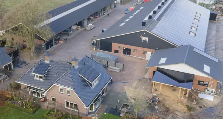 De stal is gebouwd als melkveestal en niet als legkippenstal en dat kun je nog altijd goed zien. Voor een legkippenstal is het namelijk behoorlijk breed, kort en hoog. Die breedte van de stal gaf echter wel de mogelijkheid om twee wintergardens helemaal inpanding te bouwen. In de stal zijn vier rijen volières van Chore-Time geplaatst met een frameloze mestafvoerband. Bovendien zijn er op een zijde van het dak zonnepanelen gelegd.