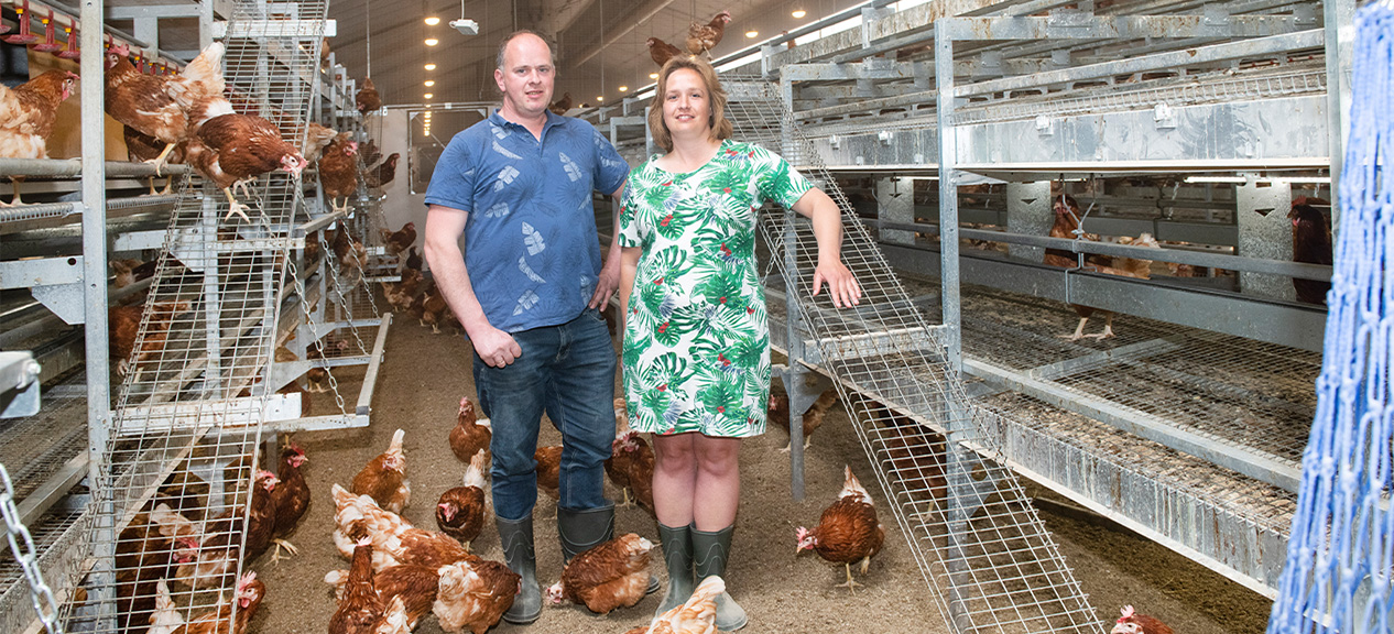 Arend en Liesbeth Bouwers zijn de derde generatie op het gemengde veehouderijbedrijf in de Gelderse plaats Ermelo. Ze wonen met hun vier kinderen en de ouders van Arend op de boerderij. Onlangs hebben ze een nieuwe volièrestal gebouwd voor biologische leghennen. Ze hebben daarmee een mooie stap gezet om het bedrijf klaar te maken voor de volgende generatie.