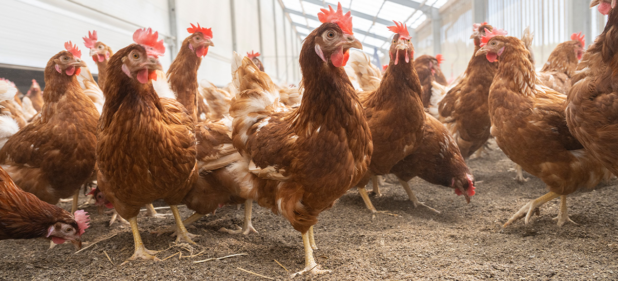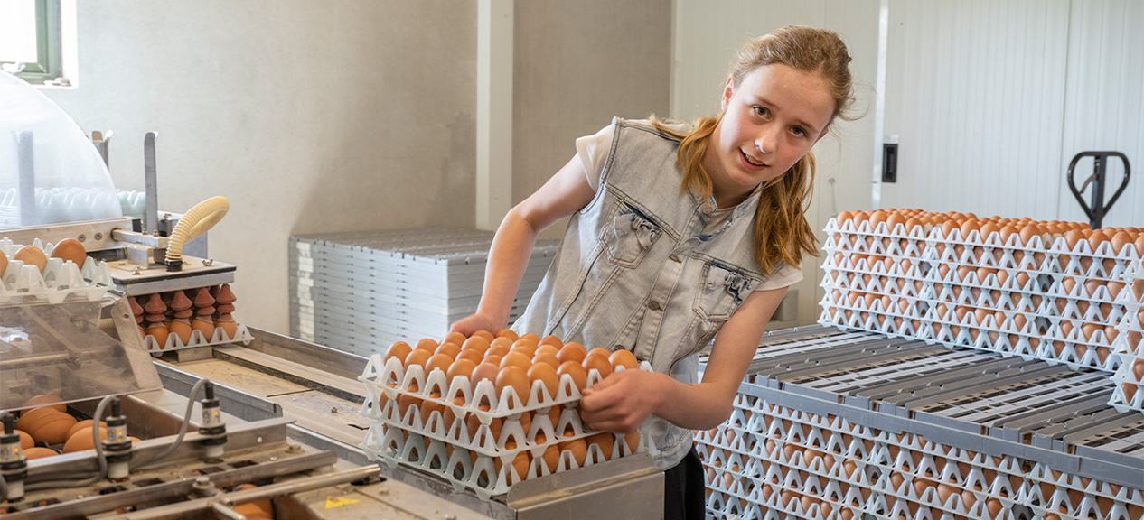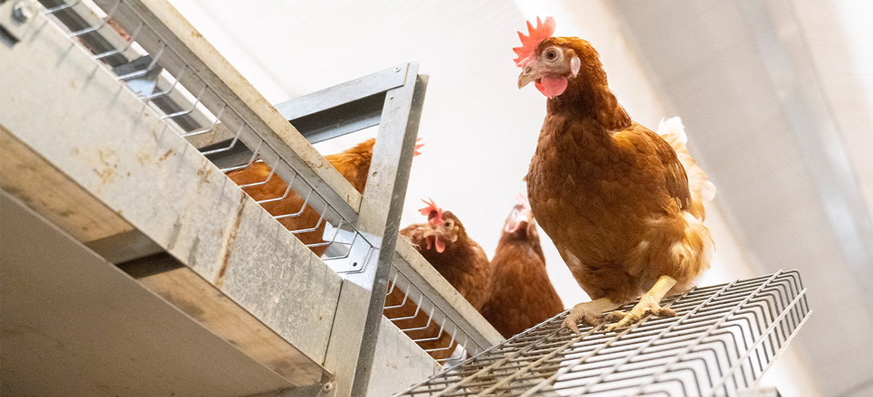 Met drie rijen volières (Salmet) biedt de stal plaats aan 9.000 biologische gehouden kippen. Ze zijn van het ras Brown Nick en afkomstig van Agromix. Met 48 weken hebben ze een legpercentage van 94,8% en een eigewicht van 61,3 gram. Met behulp van het TopFit-rondeplan worden de vier belangrijkste zaken, voer, licht, water en klimaat, in de gaten gehouden, om voor optimale prestaties te zorgen. Op dit moment worden ze gevoerd met de TopFit M Piek EK. Met de verschillende soorten biologische voeders van De Heus kunnen de hennen optimaal presteren vanaf de opstart tot het einde van de ronde. De prestaties met 48 weken zijn harstikke goed. Arend en Liesbeth zijn er dan ook erg tevreden mee en ook eierhandel Van Raai uit Woudenberg is blij met de eieren die geleverd worden.