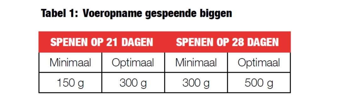 Wat is de optimale voeropname voor spenen? De Heus hanteert normen voor de hoeveelheid voer die iedere big opgenomen moet hebben in de kraamstal om goed voorbereid gespeend te kunnen worden. Deze normen zijn gebaseerd op de prestaties van gezonde gespeende biggen die het speenproces goed doorlopen. Bij bovenstaande normen moet ervan uitgegaan worden dat ongeveer 50% van de voeropname voor de laatste week voor spenen plaats dient te vinden. Als er in verhouding veel meer voer opgenomen wordt in de laatste week voor het spenen dan is er een grotere kans op verteringsproblemen rondom het spenen. De biggen zijn dan nog onvoldoende getraind geweest om voer te leren verteren. Als de optimale opnamenormen die gesteld worden niet gehaald worden dan zal er kritisch gekeken moeten worden naar de voerkeuzes, de manier van bijvoeren en de gezondheid van de biggen.