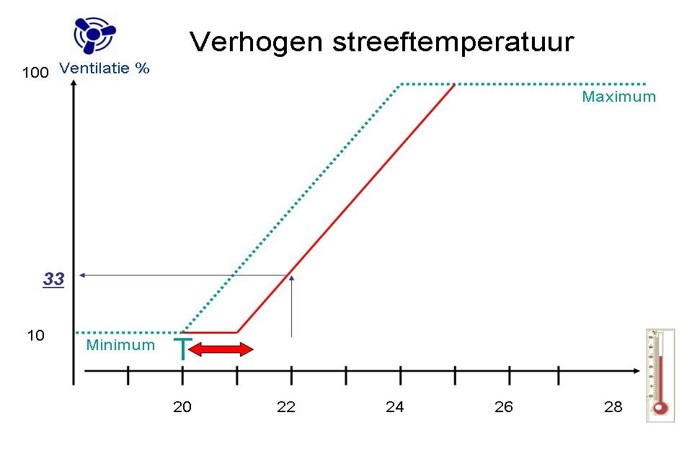Tijdens een warme dag kan de streefwaarde stal automatisch worden verhoogd waardoor de ventilatie bij een dalende buitentemperatuur sneller zal verminderen. Hierdoor wordt tocht op de dieren voorkomen bij snelle afkoeling. **
