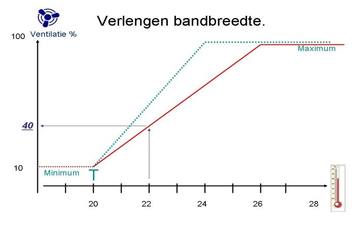 Tijdens een warme dag kan de bandbreedte automatisch worden verhoogd waardoor de ventilatie bij een dalende buitentemperatuur sneller zal verminderen. Hierdoor wordt tocht op de dieren voorkomen bij snelle afkoeling. **