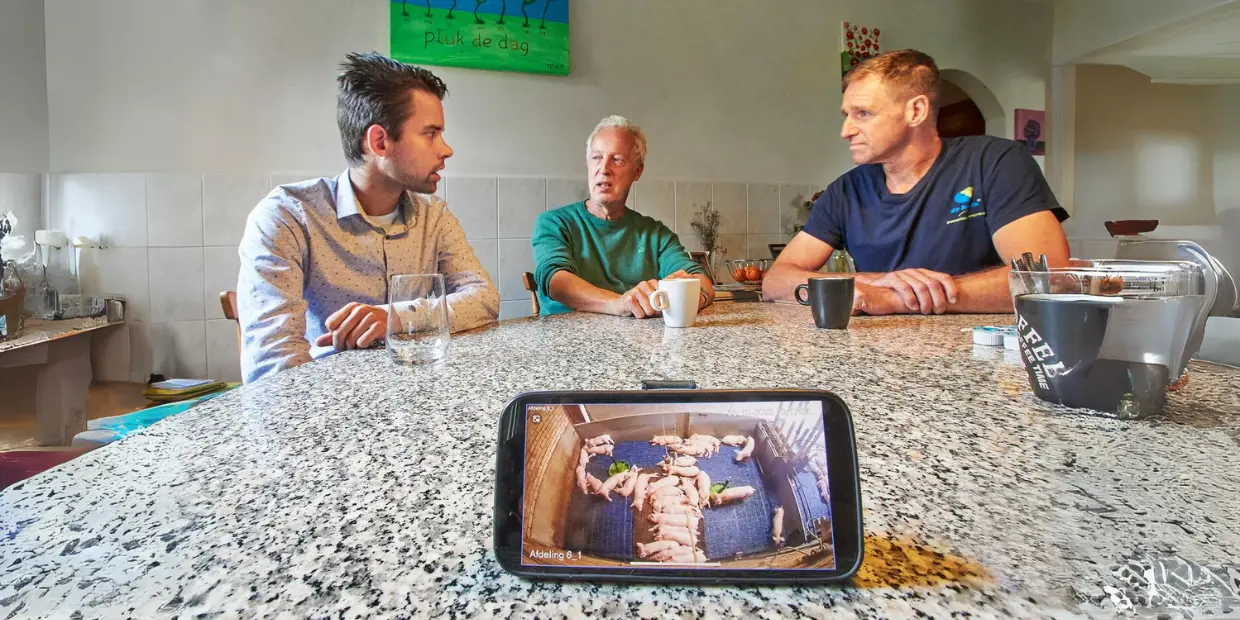 Aan tafel bij Hans Bankers kunnen de biggen live gevolgd worden op de mobiel.