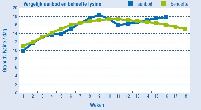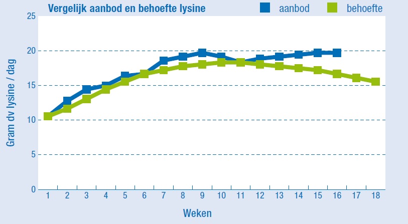 Grafiek 1 Eiwitbehoefte vleesvarkens in voorbeeldberekening uitgedrukt in darmverteerbaar lysine.