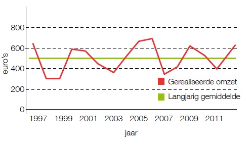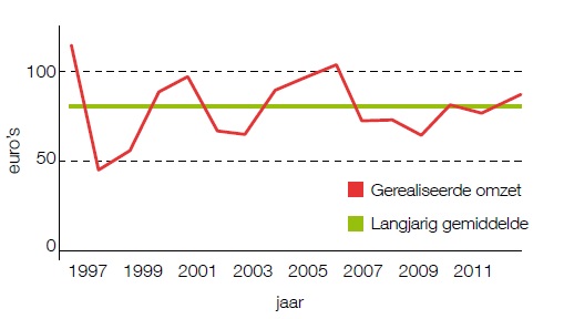 U berekent de voerwinst door de omzet en aanwas te verminderen met de voerkosten. Vervolgens deelt u de uitkomst door het gemiddeld aantal aanwezige zeugen of vleesvarkens. Als u uw voerwinst vergelijkt met die van andere bedrijven, ziet u snel hoe uw bedrijf er voorstaat. In grafiek 1 staat de voerwinst voor zeugenbedrijven in de periode 1997 tot en met 2012. De groene lijn geeft het langjarig gemiddelde weer, zo’n € 500,- per gemiddeld aanwezige zeug per jaar. Banken rekenen met het langjarig gemiddelde. U kunt dit cijfer dan ook gebruiken voor financieringsplannen. Het langjarig gemiddelde is afgeleid van de gemiddelde voerwinsten van alle zeugenbedrijven. De rode, schommelde lijn vertegenwoordigt de resultaten die elk jaar zijn behaald. De gerealiseerde voerwinst ligt tussen de € 300,- en € 700,- per zeug. Grafiek 2 is hetzelfde verhaal, maar dan voor vleesvarkens. De groene lijn is weer de gemiddelde voerwinst. Deze bedraagt rond de € 80,- per gemiddeld aanwezig vleesvarken. De rode lijn geeft de werkelijke resultaten in elk afzonderlijk jaar weer. De voerwinsten schommelden in de periode 1997 tot en met 2012 tussen de € 40,en € 120,- per vleesvarken.