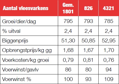 De voerwinst bij de vleesvarkens wordt bepaald door de omzet (verkoop van vleesvarkens en aankoop van biggen), de voerkosten en de aanwas. U kunt niet alle bedrijven met elkaar vergelijken. Zo wordt het gemiddelde gevormd door bedrijven die droogvoer en bedrijven die brijvoer verstrekken met bijproducten. Tot het gemiddelde behoren bedrijven die beren en gelten houden, evenals bedrijven die borgen en gelten houden. Bedrijven met beren en gelten scoren hogere groeicijfers en gunstigere voerkosten per kg groei. De bedrijfsomvang speelt ook een rol. In de kengetallenspiegel zijn tabellen opgenomen, waarin de bedrijven gesorteerd zijn naar bedrijfsomvang, voersysteem en dergelijke. Bij analyseren van voerwinstcijfers is het belangrijk ook naar deze tabellen te kijken. Dit geldt bijvoorbeeld voor welzijnsconcepten, waarbij u minder dieren per oppervlakte mag houden. Dit leidt tot een lagere stalbezetting en hogere vaste lasten per varken. Deelnemers aan deze concepten krijgen echter compensatie in de vorm van extra toeslagen. Zij realiseren een hogere opbrengstprijs per kg en betere technische resultaten.