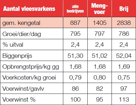 In de kengetallenspiegel voor de vleesvarkenshouderij zijn er naast een ‘basisoverzicht’ ook vergelijkingsoverzichten. Bedrijven zijn ingedeeld naar bijvoorbeeld bedrijfsomvang, toepassing van enkel mengvoer of brijvoer. Er zijn ook overzichten waarin de bedrijven zijn ingedeeld naar netto voerkosten per kg groei of kg startvoer per opgelegde big. Uit tabel 2 blijkt dat de grotere varkensbedrijven een hogere voerwinst halen. De oorzaak daarvan is de lagere voerkosten op grote bedrijven. Dit wordt onder andere verklaard doordat in deze groep meer bedrijven zitten die brijvoer verstrekken. Een soortgelijk verschil treedt op bij het vergelijken van de bedrijven die brijvoer voeren met bedrijven met droogvoer in tabel 3. Ook hier zijn de voerkosten per kg groei beduidend lager. Zowel voor mengvoerbedrijven als brijvoerbedrijven zijn er overzichten met indeling naar bedrijfsgrootte.