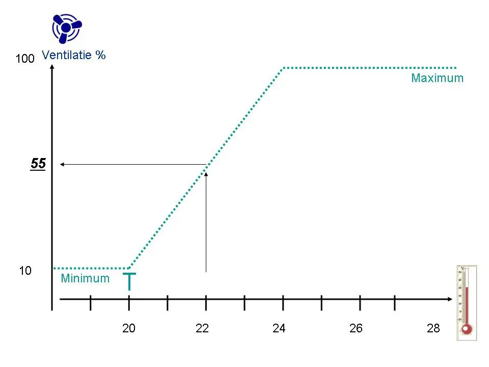 Door het verlagen van de maximum ventilatie tot 60% bij 24°C wordt de werkelijke ventilatie bij 22°C 35%.