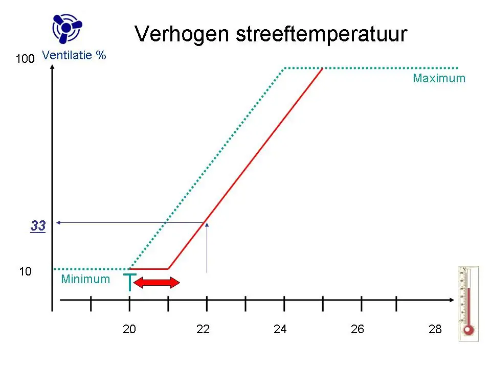 Door het verhogen van streeftemperatuur van 20°C naar 21°C zakt de werkelijke ventilatie bij 22°C terug naar 33%.