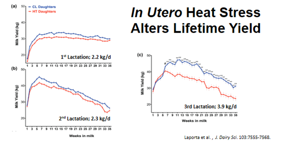 De grafieken laten duidelijk het effect zien op de melkproductie van vaarzen die geboren zijn uit koeien met en zonder hittestress. Ook tijdens de lactatie zijn er nieuwe inzichten ontstaan over het herstellend vermorgen van de koe. Zo blijkt dat koeien die aan het begin van de lactatie hittestress ervaren, nog kunnen herstellen doordat de uier in deze fase een hoog regeneratief vermogen heeft. Koeien die zich echter in het midden van de lactatie bevinden, herstellen veel minder goed en komen niet meer terug op hun oorspronkelijke productieniveau. Daarnaast blijkt dat droge koeien het meest kwetsbaar zijn voor de gevolgen van hittestress.