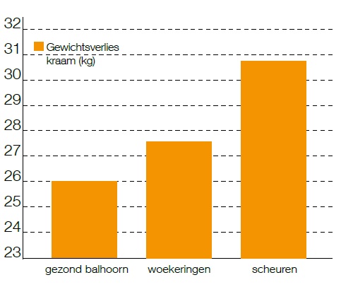 Grafiek 1: Conditie van het balhoorn en gewichtsverlies in kraamstal (kg)