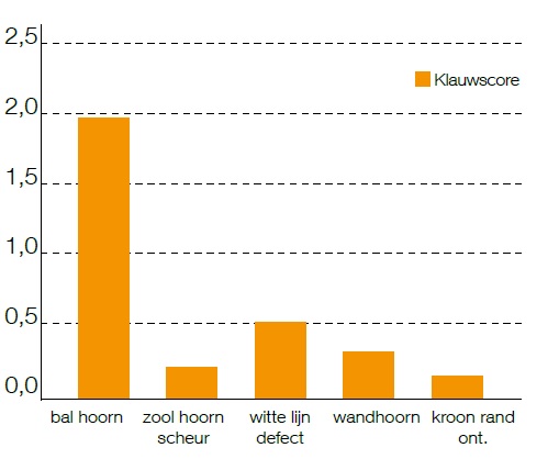 Klauwscores op probleembedrijven: De meeste zeugen hebben enige of ernstige afwijkingen in het balhoorn. Overige afwijkingen komen minder voor maar kunnen wel pijnlijk zijn en tot ontsteking leiden.