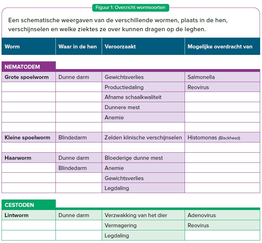Op bedrijven met scharrel-, freiland- en biologische hennen wordt vaak een aantal keer per ronde een wormbesmetting geconstateerd. Een fikse besmetting met deze parasieten kan leiden tot een verstoring van de vertering en een beschadiging van de darmwand. Het is dus belangrijk om de wormen effectief te bestrijden om de negatieve gevolgen voor de productie te beperken.