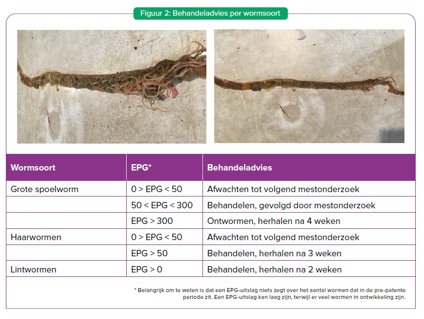 Om te bepalen hoe intensief er behandeld moet worden, moet je weten in welke mate een koppel besmet is met wormen. Dat kan met behulp van een mestonderzoek. Daarbij wordt het aantal wormeieren per gram mest geteld (EPG = Eggs per gram). De kosten van een mestonderzoek zijn ongeveer € 25,-. Belangrijk is dat het mestmonster goed genomen wordt. Dat betekent dat het een representatief mestmonster moet zijn van verse mest, verdeeld over de stal. Er dienen circa 150 verse keutels verzameld te worden. Gemiddeld wordt er om de zes weken mestonderzoek verricht. Afhankelijk van de bedrijfsgeschiedenis kan dit natuurlijk op- of afgeschaald worden.