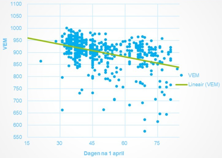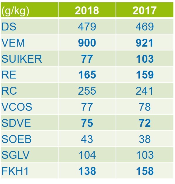De relatief late mestaanwending gevolgd door een explosief hoge grasgroei heeft een zichtbaar effect op de samenstelling van de voorjaarskuilen in 2018. De gemiddelde voederwaarden van voorjaarskuilen in 2018 en 2017 zijn tegen elkaar uitgezet in tabel 1. Gemiddeld bevatten de voorjaarskuilen meer eiwit dan in 2017. Het aandeel suiker is fors lager wat samen met een hoger ruwe celstof gehalte zorgt voor een lager VEMniveau. In figuur 1 is het verloop van VEM en het aantal dagen na 1 april over het voorjaar weergegeven.