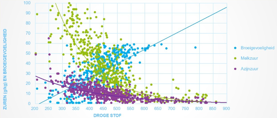 Ook dit jaar zien we een grote spreiding in drogestofgehaltes tussen graskuilen. Gemiddeld ligt het drogestofgehalte op 48%. Veel kuilen zijn te droog gewonnen. Er is een duidelijk verband tussen conservering van de graskuilen en het drogestofgehalte (figuur 2). In de drogere kuilen is het suiker in mindere mate omgezet naar organische zuren en is de pH hoger. Bovendien zijn de droge kuilen minder goed verdicht bij het aanrijden waardoor de broeigevoeligheid sterk toeneemt. Broei met als gevolg verlies van smaak en voederwaarde ligt op de loer bij deze kuilen. In de nattere kuilen zijn suikers omgezet in melkzuur en azijnzuur waardoor deze kuilen een lage pH hebben en goed zijn geconserveerd. Deze nattere kuilen zijn erg smakelijk voor de koe en stimuleren melkgift. Uitdaging is benutting van het hogere aandeel onbestendig eiwit. Het combineren van deze nattere voorjaarskuilen met een structuurrijke zomerkuil en/of een flink aandeel maïs in het rantsoen helpt hierbij.
